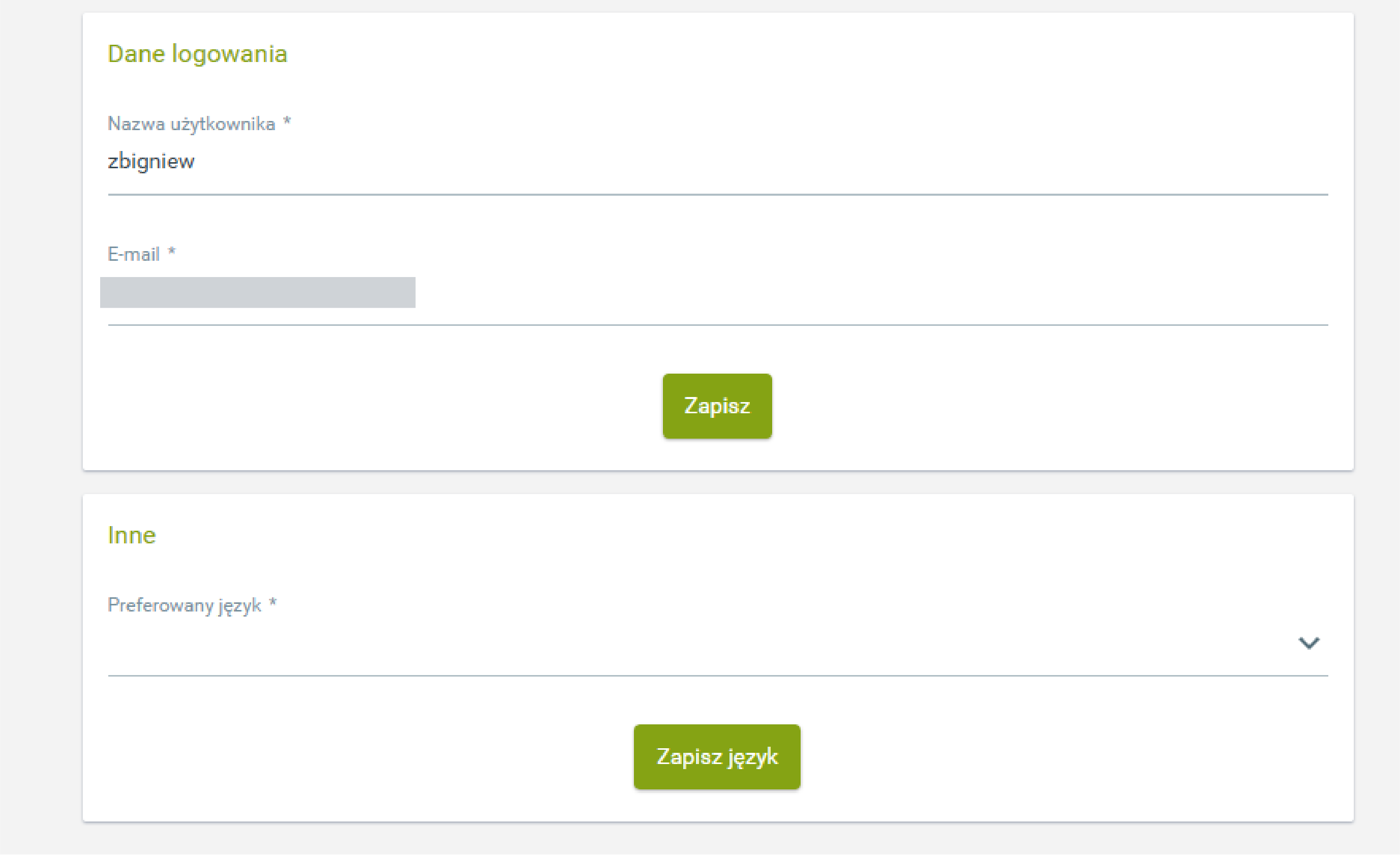 W pierwszej sekcji widać podany wcześniej adres mailowy i numer telefonu. Za pomocą ikony plusa można dodać inne dane, za pomocą ikony 3 kropek przy istniejących danych można nimi zarządzać.