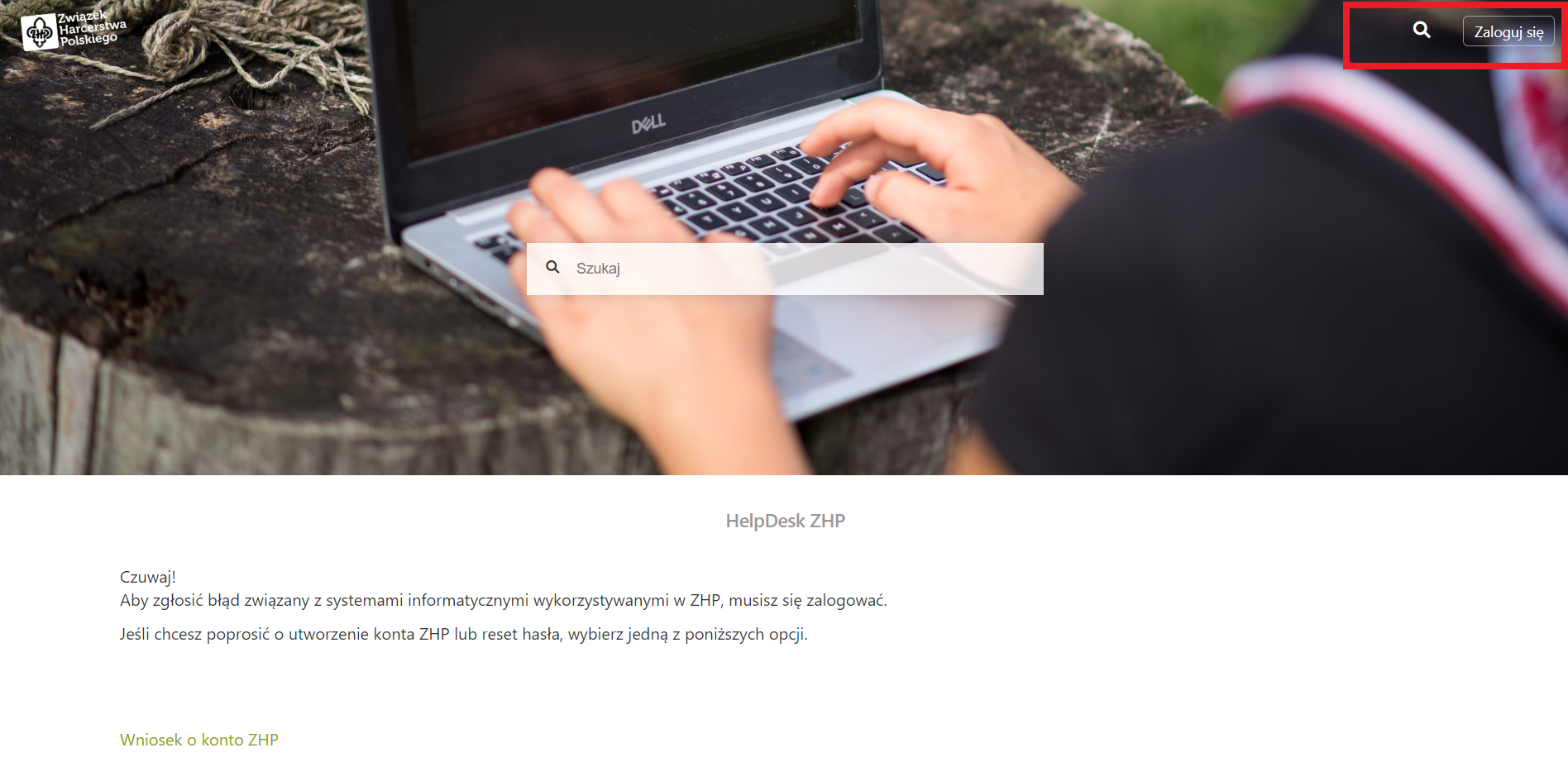 Po wejściu na stronę https://helpdesk.zhp.pl naley kliknąć przycisk zaloguj w prawym górnym rogu ekranu. Zalogować do helpdesku może się każdy posiadać konta ZHP (Office365). Bez logowania dostępny będzie tylko formularz do zakładania konto Office365.