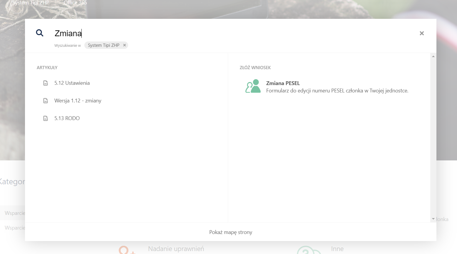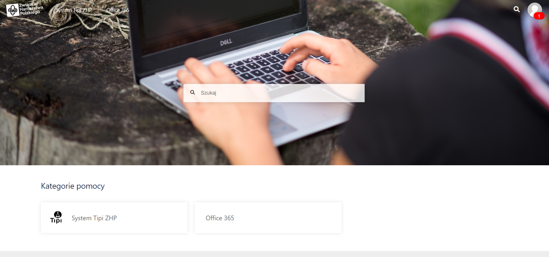 Po zalogowaniu zobaczymy wyszukiwarkę, która umożliwia znalezienie rozwiązania naszego problemu lub formularza, który umożliwi zgłoszenie problemu do administratora. Poniżej znajdują się odnośniki do dedykowanych portali wsparcia (osobnych dla różnych narzędzi wykorzystywanych w ZHP).