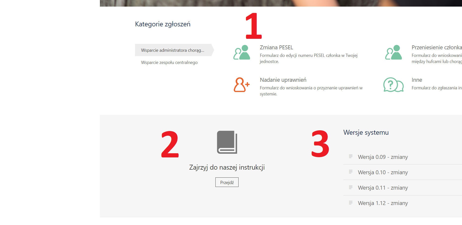 - link do instrukcji systemu (znajdują się w niej cenne informacje, które mogą pomóc rozwiązać problem bez konieczności jego zgłaszania)