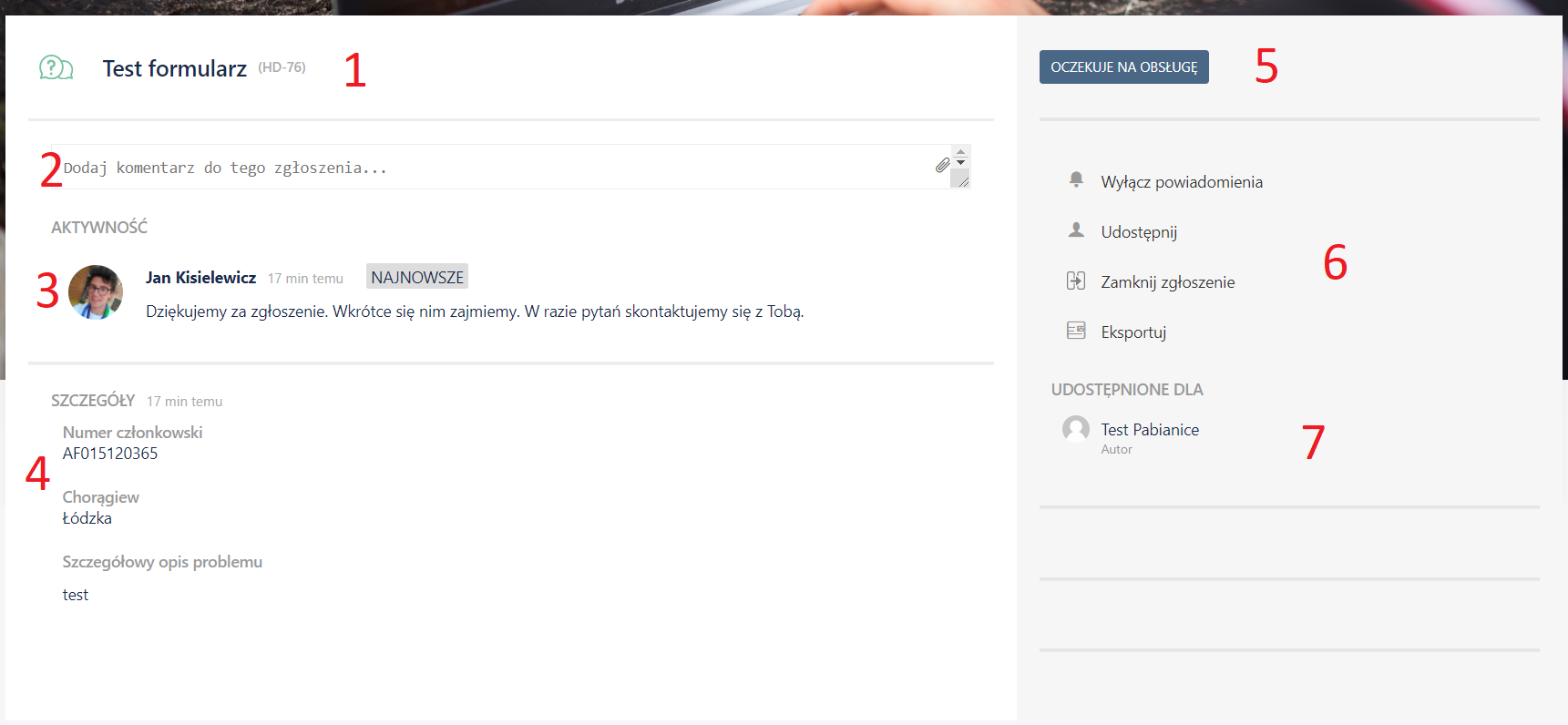 - Sekcja aktywność zawierająca wszystkie Twoje komentarze oraz odpowiedzi osoby obsługującej zgłoszenie