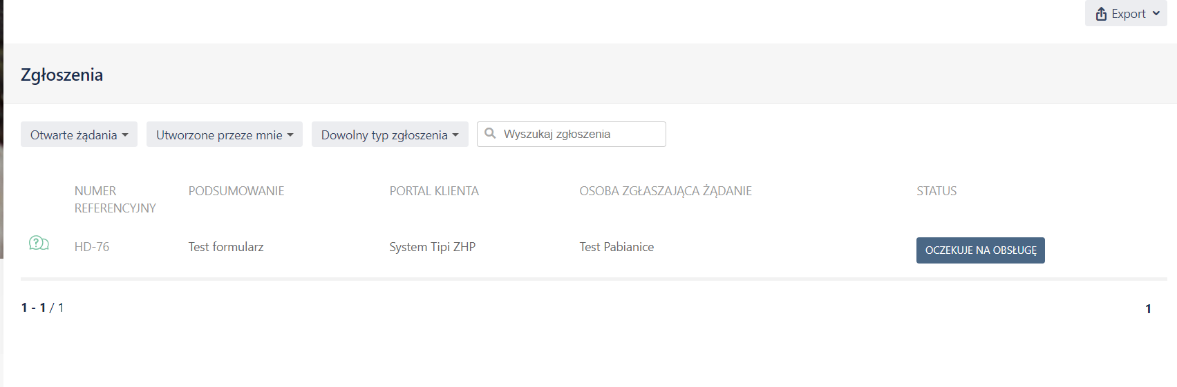 Lista zgłoszeń umożliwia ich filtrowanie za pomocą 3 kryteriów oraz wyszukiwanie, a także eksport wszystkich zgłoszeń.