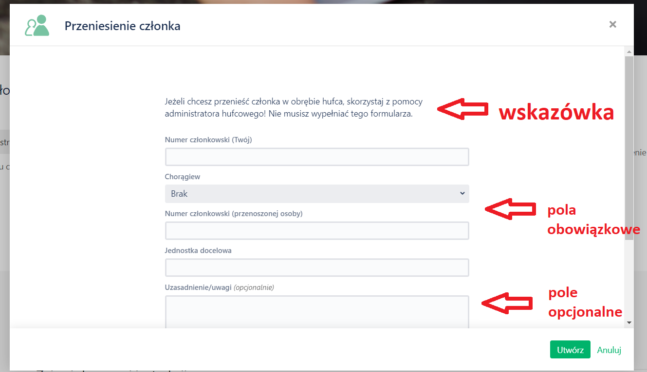Każdy formularz zawiera pola wymagane i opcjonalne (te drugie mają informację w nawiasie). Część formularzy zawiera również wskazówkę znajdującą się u góry formularza. Aby zgłosić błąd należy uzupełnić pola i nacisnąć przycisk Utwórz.