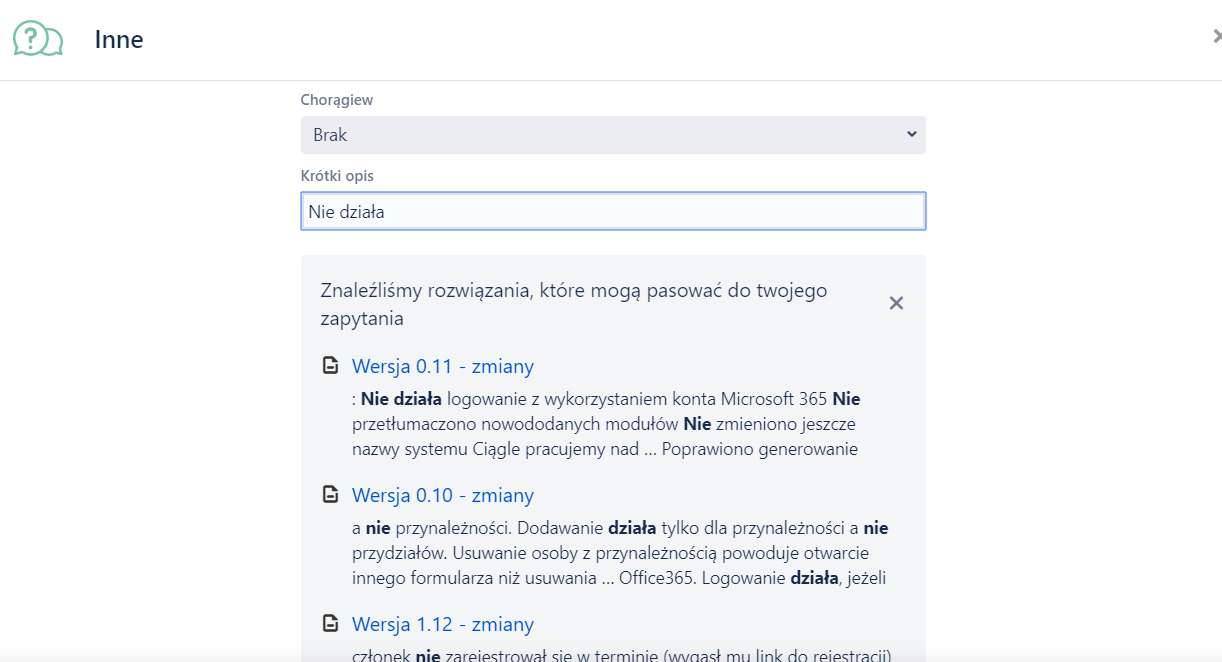 System będzie podpowiadał pomocne artykuły z instrukcji podczas opisywanie błędu, być może one zapewnią Ci odpowiednią pomoc.