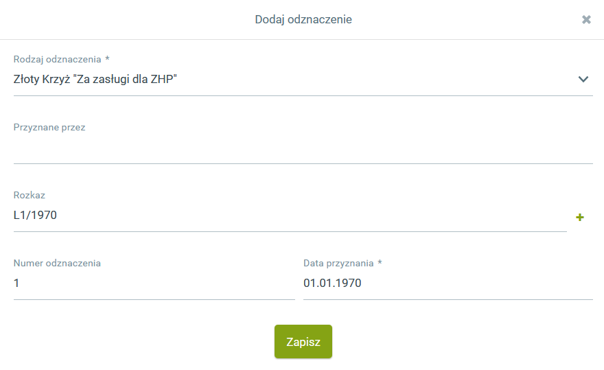 Obowiązkowym polem jest rodzaj odznaczenia przyznanego członkowi ZHP: np. Krzyż „Za zasługi dla ZHP", List pochwalny Naczelnika ZHP.