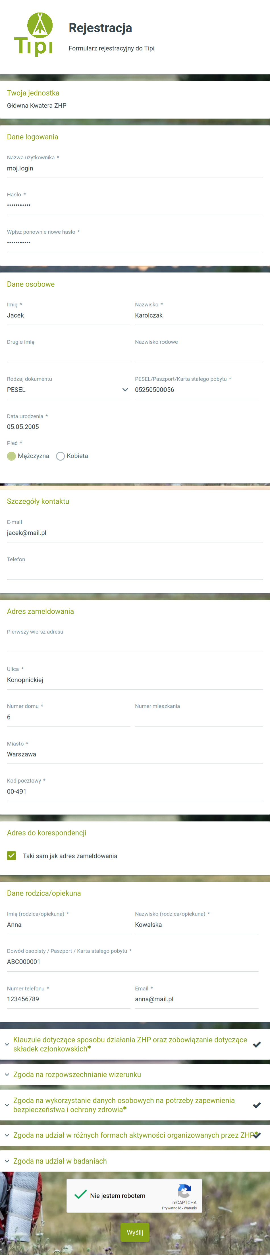 ** Dotyczy rejestracji członków ZHP, którzy nie ukończyli 16 lat.