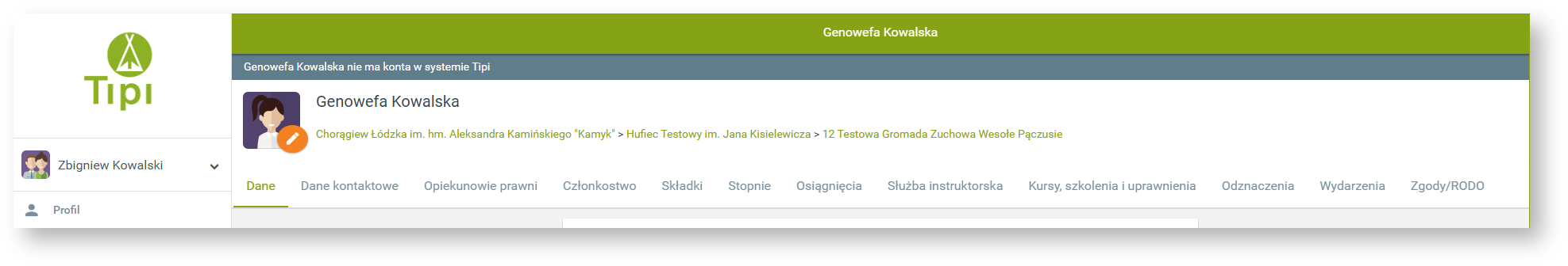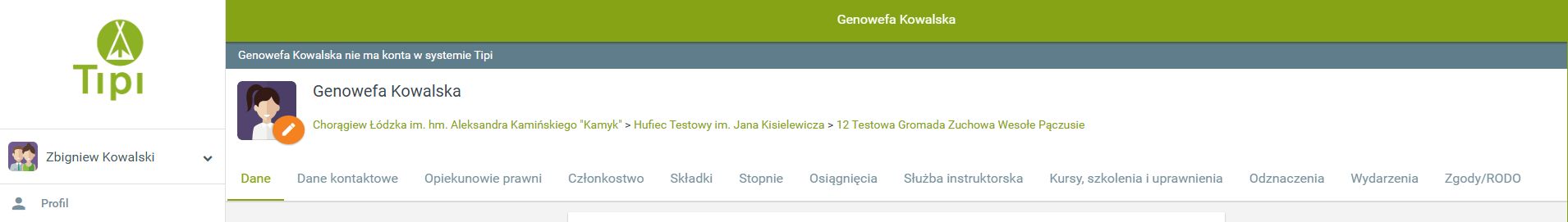Po przejściu do profilu swojego dziecka mamy dostęp do kilku różnych zakładek zawierających dane osobowe i harcerskie. W panelu u góry strony możemy wgrać zdjęcie profilowe dziecka (klikając na pomarańczową ikonkę edycji), sprawdzić przydział dziecka - czyli informację do jakiej drużyny należy (zielony tekst pod imieniem i nazwiskiem dziecka) oraz przejść do odpowiedniej zakładki z danymi.