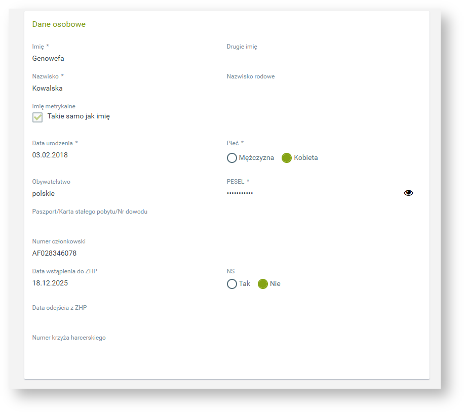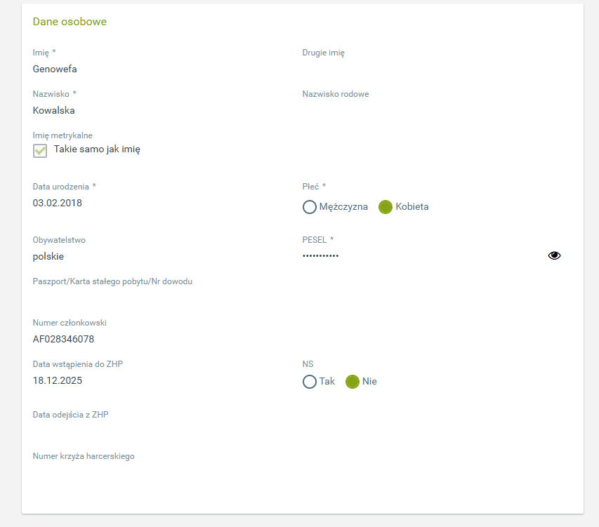 W tej sekcji analogicznie jak w przypadku rodzica mamy wybrane dane osobowe a także podstawowe dane dotyczące członkostwa w ZHP - w tym datę dołączenia oraz numer członkowski. Tych danych nie możemy edytować samodzielnie.