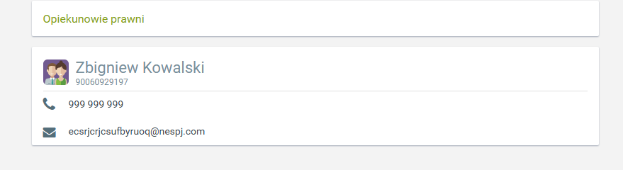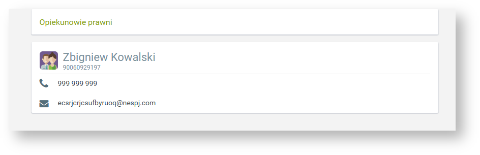W tej zakładce widzimy wszystkich opiekunów prawnych powiązanych z dzieckiem w systemie. Tutaj zobaczysz swoje dane.