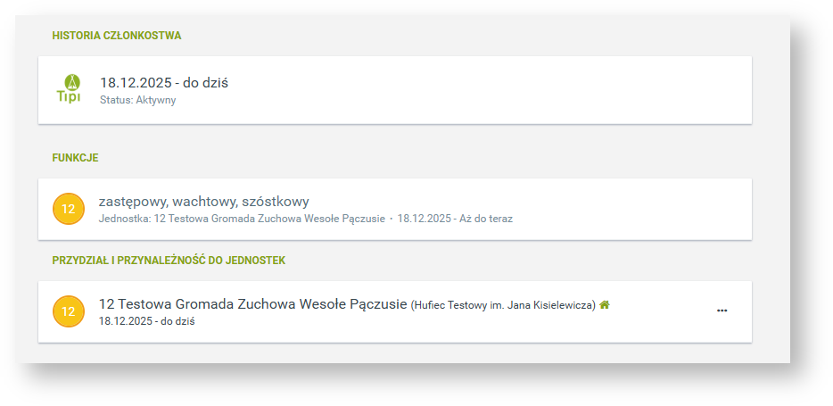 Tutaj znajdują się informacje o byciu członkiem ZHP. Zazwyczaj będzie tutaj jeden wpis z datą dołączenia do ZHP. W przypadku osób, które np. odeszły z ZHP a potem wróciły, wpisów z konkretnymi datami okresów członkostwa może być więcej.